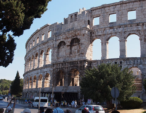 Pula and its Roman ruins. Our next stop was the ancient town of Pula, with rich Roman ruins including a Roman amphitheater far more intact than the Colosseum in Rome.